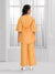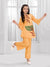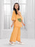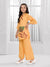 Girls’ Co-Ord set in Blended cotton fabric, designed with a stylish placement print. The set features a front-buttoned high-neck top with three-quarter sleeves and a flared hem, paired with wide-leg pants. The pastel pink base with colorful artistic prints adds a trendy and vibrant look, making it a perfect choice for casual outings and festive occasions.