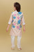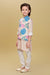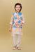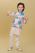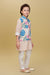 Add a refreshing charm to your little one’s festive look with this pastel peach kurta set featuring a stylish printed Nehru jacket. The jacket showcases tropical leaf and floral prints in soothing shades of blue, pink, and green, accented with elegant pearl buttons for a polished finish. The set includes a solid peach kurta and white churidar, crafted from soft, breathable fabric for all-day comfort. Perfect for festive occasions, weddings, and family celebrations.