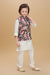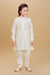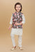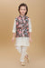 Make your little one stand out in this charming 3-piece ethnic set featuring a olive green floral printed Nehru jacket paired with a white kurta and churidar. The jacket showcases elegant floral patterns with pearl button detailing, adding a festive flair to the outfit. Crafted from soft and breathable fabric, this ensemble ensures comfort and style, perfect for weddings, festive occasions, and family gatherings.