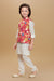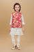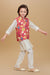 Make your little one stand out in this charming 3-piece ethnic set featuring a bright red floral printed Nehru jacket paired with a offwhite kurta and churidar. The jacket showcases elegant multicolour floral patterns with pearl button detailing, adding a festive flair to the outfit. Crafted from soft and breathable fabric, this ensemble ensures comfort and style, perfect for weddings, festive occasions, and family gatherings.