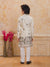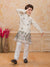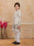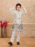 Add a refreshing charm to your little one’s festive look with this pastel peach kurta set featuring a stylish printed Nehru jacket. The jacket showcases tropical leaf and floral prints in soothing shades of blue, pink, and green, accented with elegant pearl buttons for a polished finish. The set includes a solid peach kurta and white churidar, crafted from soft, breathable fabric for all-day comfort. Perfect for festive occasions, weddings, and family celebrations.