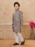 Add a refreshing charm to your little one’s festive look with this pastel peach kurta set featuring a stylish printed Nehru jacket. The jacket showcases tropical leaf and floral prints in soothing shades of blue, pink, and green, accented with elegant pearl buttons for a polished finish. The set includes a solid peach kurta and white churidar, crafted from soft, breathable fabric for all-day comfort. Perfect for festive occasions, weddings, and family celebrations.
