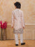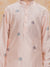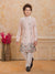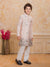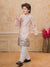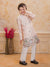 Add a refreshing charm to your little one’s festive look with this pastel peach kurta set featuring a stylish printed Nehru jacket. The jacket showcases tropical leaf and floral prints in soothing shades of blue, pink, and green, accented with elegant pearl buttons for a polished finish. The set includes a solid peach kurta and white churidar, crafted from soft, breathable fabric for all-day comfort. Perfect for festive occasions, weddings, and family celebrations.