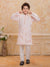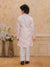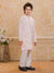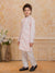 Add a refreshing charm to your little one’s festive look with this pastel peach kurta set featuring a stylish printed Nehru jacket. The jacket showcases tropical leaf and floral prints in soothing shades of blue, pink, and green, accented with elegant pearl buttons for a polished finish. The set includes a solid peach kurta and white churidar, crafted from soft, breathable fabric for all-day comfort. Perfect for festive occasions, weddings, and family celebrations.