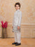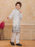 Add a refreshing charm to your little one’s festive look with this pastel peach kurta set featuring a stylish printed Nehru jacket. The jacket showcases tropical leaf and floral prints in soothing shades of blue, pink, and green, accented with elegant pearl buttons for a polished finish. The set includes a solid peach kurta and white churidar, crafted from soft, breathable fabric for all-day comfort. Perfect for festive occasions, weddings, and family celebrations.