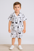 Keep it cool and artsy with this monochrome 2-piece co-ord set for boys. Designed in fine-quality cotton, the set includes a short-sleeved button-down shirt and matching shorts featuring a bold black abstract print on a crisp white base. Lightweight and breathable, it's perfect for daily wear, vacations, or casual summer days.