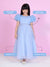 Grace your little one in this dreamy sky blue gown, adorned with intricate all-over embroidery that adds a touch of timeless charm. Designed with puff gather sleeves for a soft, voluminous silhouette, this gown is perfect for special occasions. The waist is beautifully highlighted with a delicate pearl lace embellishment, adding a refined and graceful finish. Ideal for birthdays, weddings, or festive celebrations, this gown blends elegance and comfort in every stitch.