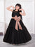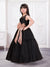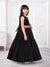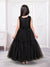 Let your little star shine in this elegant black net gown designed for stylish celebrations. Crafted from soft, premium net fabric, this gown features a layered, flared silhouette that creates a beautiful flow and graceful movement. The sleeveless bodice with a sheer neckline adds a touch of modern charm while ensuring comfort. The highlight of the gown is the stunning sequin-embellished bow and waist belt in a contrasting rose-gold tone, adding sparkle and a statement look. The tiered net skirt enhances volume, making it perfect for twirls and special moments.