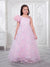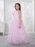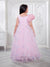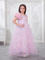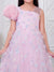 Dress your little one in timeless elegance with this beautiful pastel pink organza gown. Crafted from premium-quality organza fabric, this gown features delicate floral motifs scattered across the bodice and skirt, accented with subtle shimmer details for a dreamy, fairy-tale look. The soft inner lining ensures comfort while maintaining a graceful, flowy silhouette. The gown is designed with a stylish asymmetrical neckline, highlighted by a statement 3D floral puff sleeve on one side and a sheer organza panel on the other, adding a modern yet charming touch. The voluminous flared skirt enhances movement, making it perfect for twirls and special moments.