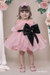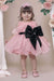Let your little girl make a dramatic entrance in this stylish MiniStitch frock. Crafted from soft, flowy organza fabric, this dress features a tiered, voluminous skirt that's perfect for twirling. The delicate Peach shade is beautifully contrasted by a stunning, oversized black satin bow embellished with pearls at the waist. The unique off-shoulder/sleeveless design adds a modern touch. Perfect for fashion-forward birthdays, holiday events, or any special occasion where she needs to shine.