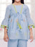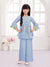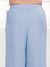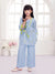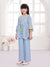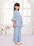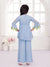 This trendy powder blue peplum-style tunic and matching straight-fit palazzo set offers a fresh, boho-chic take on modern ethnic wear. The outfit features a vibrant lime-green contrast piping and a drawstring waist tie adorned with playful dual-tone tassels that mirror the detailing on the sleeves. Designed with dramatic bell sleeves finished with intricate lace and tassel fringe, the top is further elevated by delicate floral embroidery and subtle Mirror highlights. Crafted from breathable, lightweight fabric, this co-ord set ensures maximum comfort for celebrations like Mehendi or festive gatherings.