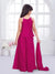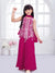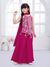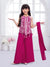 Make a bold statement with this striking fuchsia pink ensemble, featuring a sleeveless kurta meticulously detailed with ornate white thread embroidery in a geometric and floral mesh pattern. The top is designed with a unique pointed hemline accented by delicate white tassels, providing a modern edge to the traditional aesthetic. It is paired with matching, wide-leg flared palazzos that drape beautifully and a solid pink dupatta to round out the festive look. The vibrant color and intricate craftsmanship make this outfit a perfect pick for festive gatherings and wedding celebrations.