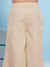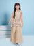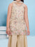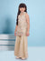 Radiate timeless charm with this elegant champagne-gold sharara set, featuring a sleeveless tunic intricately adorned with pink and silver floral embroidery and shimmering sequin work. The kurta is finished with a striking wide scalloped hemline that showcases heavy geometric sequin detailing, paired perfectly with voluminous, flared sharara pants that add a graceful movement to every step. To complete the traditional look, the set comes with a lightweight matching dupatta. This ensemble is a perfect blend of luxury and comfort, making it a standout choice for weddings, sangeet ceremonies, and grand festive occasions.
